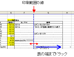 ![]() | 表示を改ページプレビューにすると印刷範囲が ブルーの線で表示されますので、それを表の端まで ドラックします。 |